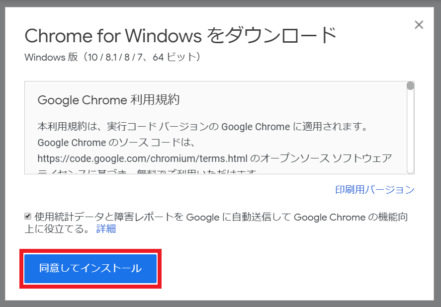 ③「Chrome for Windowsをダウンロード」という画面が表示されますので、利用規約を確認し、[同意してインストール]をクリックします。