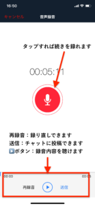 画面下部にある「送信」をタップすると、投稿することができます。再録音や録音内容の確認なども可能です。