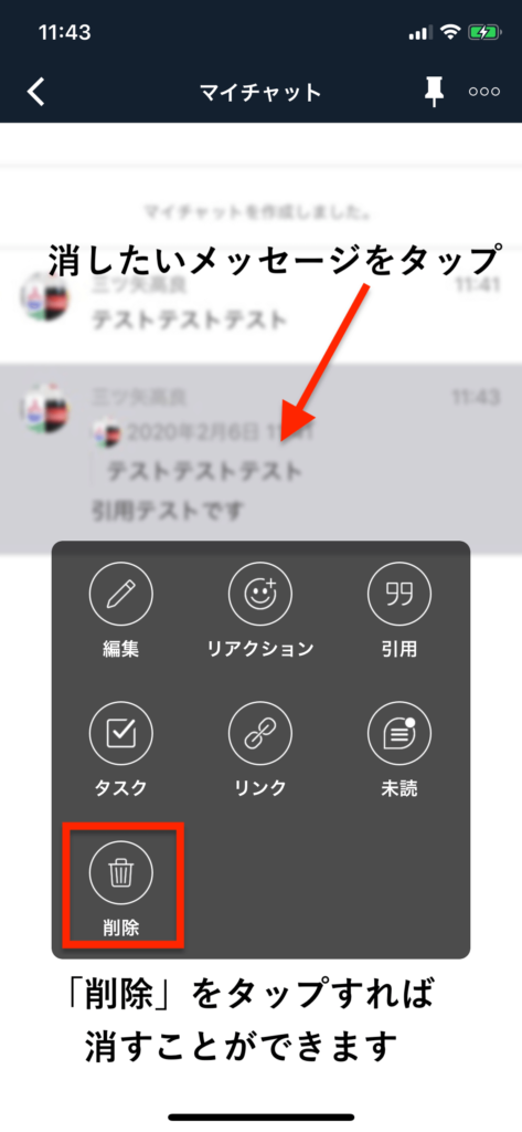 消したいメッセージをタップし、出てきたメニューの中にある「削除」をタップすれば消すことができます。
