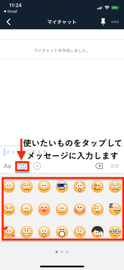 タップすると、下部に絵文字がたくさん出てきますので、使いたいものをタップするとメッセージに入力されます。