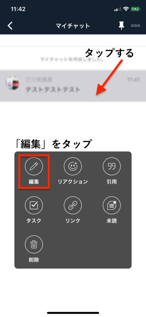 するとメッセージの右下に項目が出てきますので、「編集」をタップします。