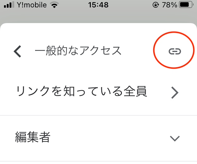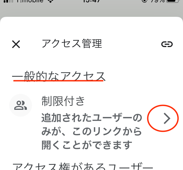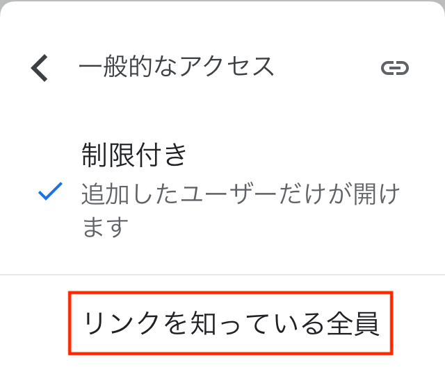 ⑥「制限付き」の横の>をタップし「リンクを知っている全員に変更」