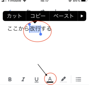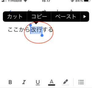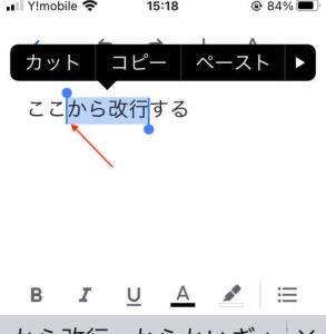テキストの選択範囲を変更した場合は▼青マーカーを移動させます。