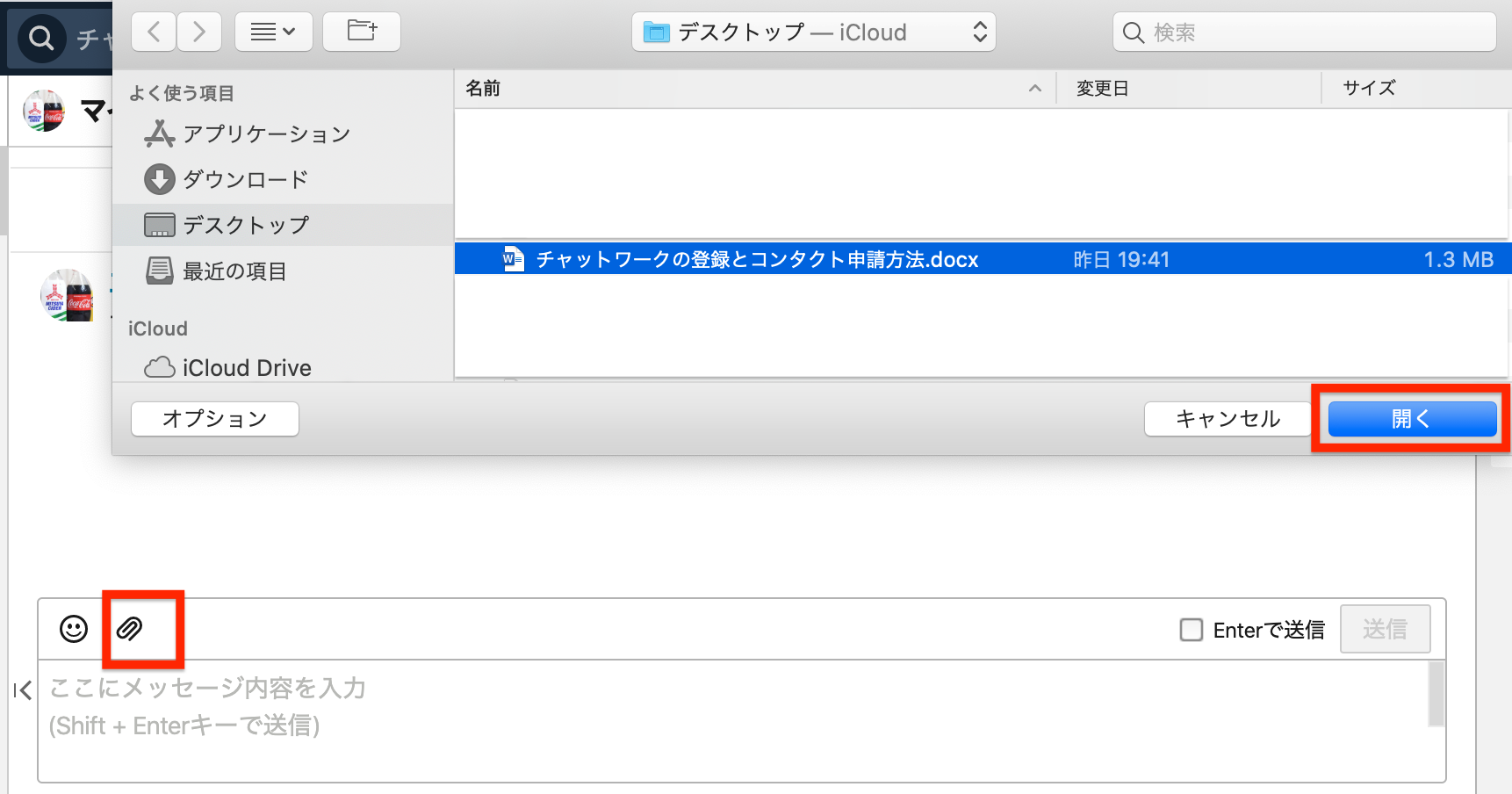 まず、メッセージ欄にあるクリップマークをクリックしてください。
