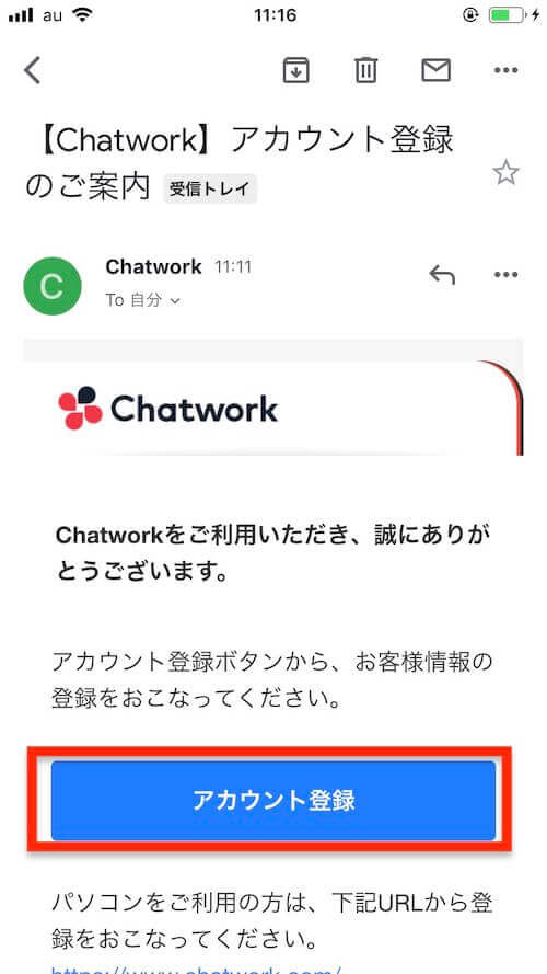 届いたメールを開き、「アカウント登録」をクリックします。