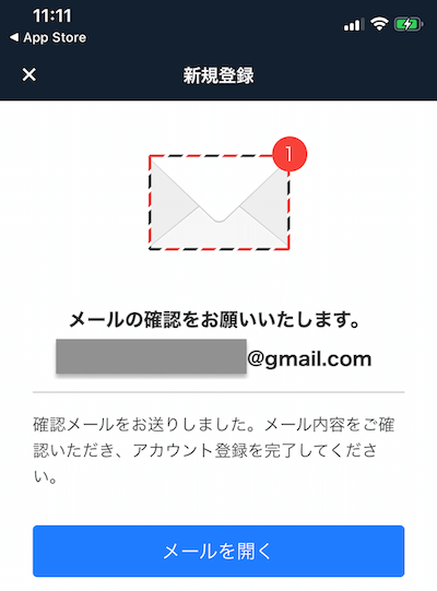 下記画面が表示されますので、メールボックスを開き、確認メールが届いているか見てみてください。